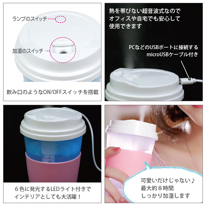 カップ型 超音波加湿器 FUNNY CUTE ピンク ブルー かわいい 卓上 USB電源 LEDライト付き オシャレ 家電 乾燥対策 シンプル 家電 加湿器 オフィス 8時間 雑貨