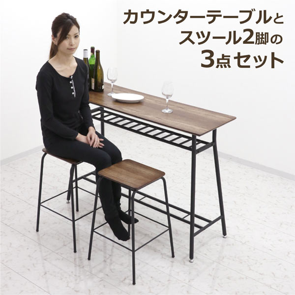 バーカウンター テーブル カウンターテーブル デスク 3点セット 幅 120cm 高さ 90cm ダークブラウン 収納棚付き バーチェア 椅子 カウンターチェア付き 2脚 おしゃれ スタイリッシュ インテリア 木製 木目調 北欧 カフェ風 Bar風 送料無料 楽天 通販